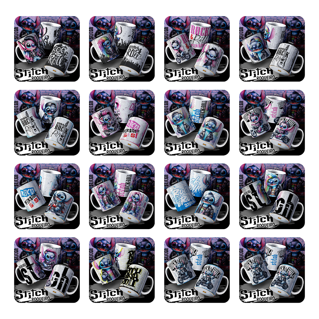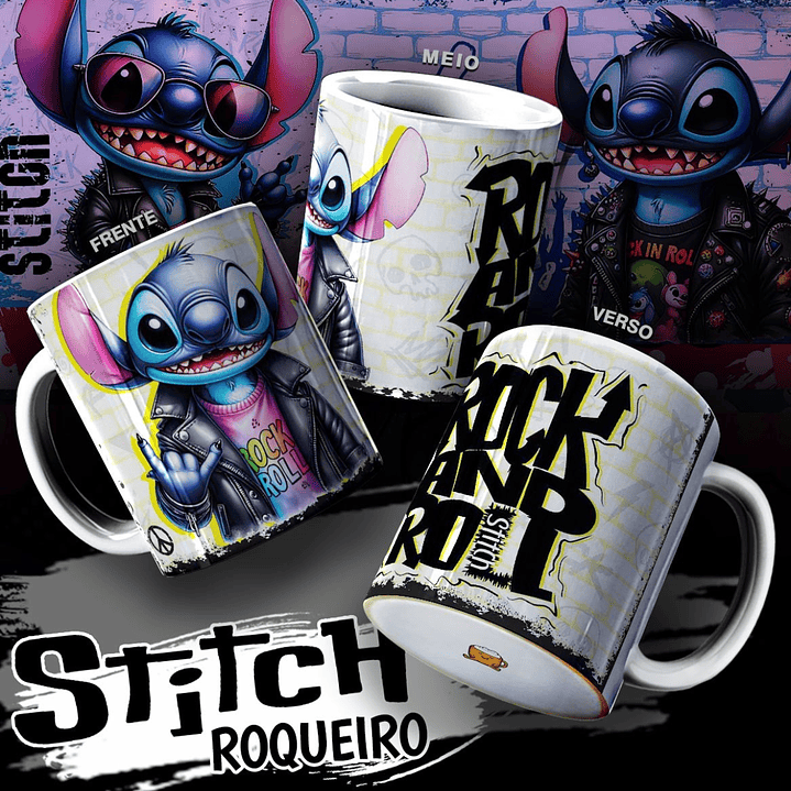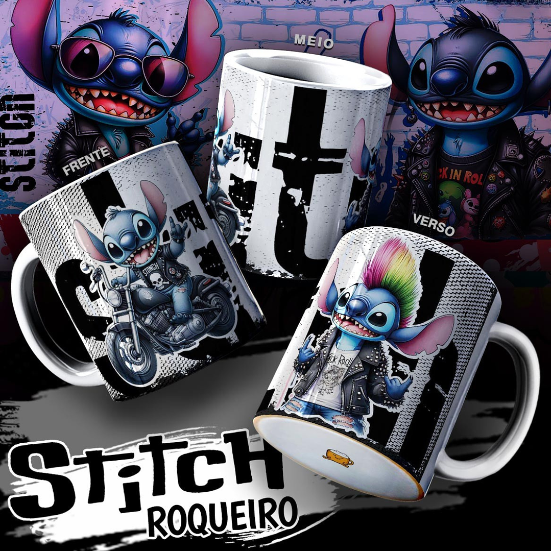 Pack Artes Sublimação Canecas Stitch Roqueiro